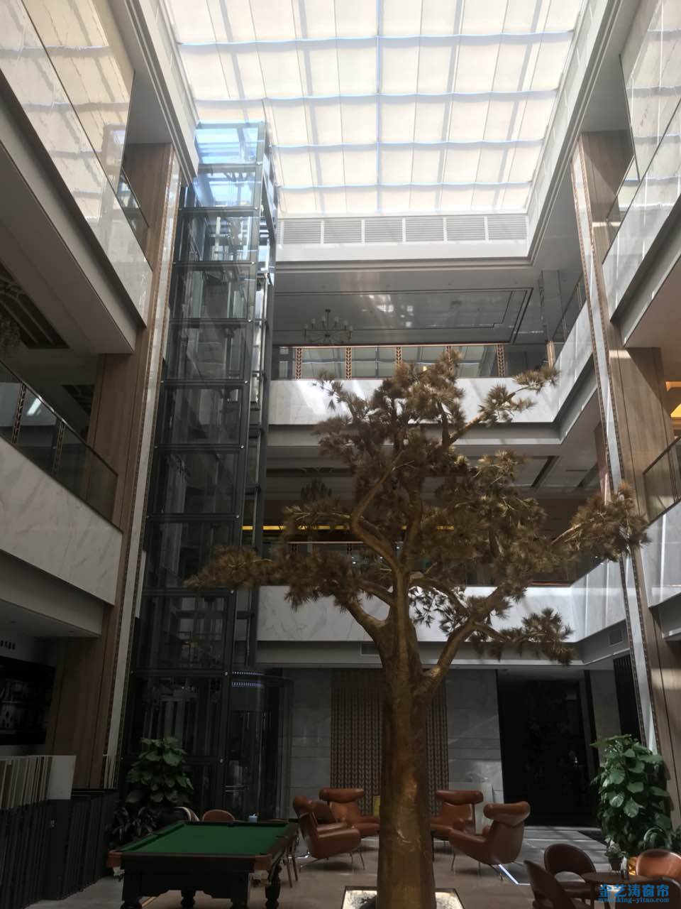 強輝陶瓷展廳的中庭玻璃采光頂應用雖然可解決建筑內部采光的問題,但隨之而來的也是人們急切需要的遮陽需求。為了不影響員工們的辦公,以及客戶的上門參觀的舒適環(huán)境,強輝的采購經(jīng)理通過百度搜索佛山電動天棚簾廠家,找到了我們金藝濤窗簾。