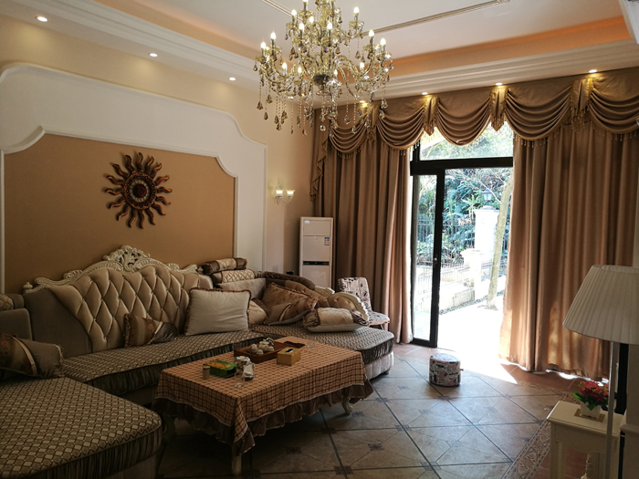 別墅客廳窗簾的布藝訴求環境的素雅大方、寬敞和光線明亮,色彩應與墻壁、家私等相協調,建議采用中間色調。在家裝的風格上,又可分為中式、歐式、休閑三大主題。款式上多見懸掛、對開、落地式樣,外簾飾窗紗,里簾采用半透明的窗簾布效果好,配以簾幔,附以窗櫻、飾帶等進一步修飾,效果更好。